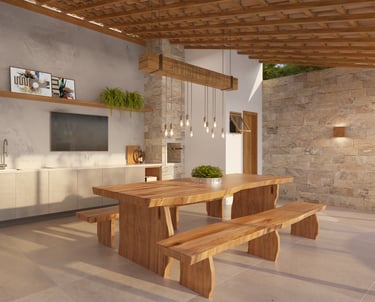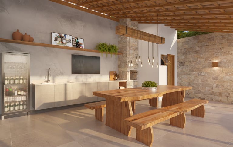 A Área Gourmet projetada pelo Arqmea para o Residencial Link Artemia, em Feira de Santana, une rusticidade e funcionalidade. Optamos pela marcenaria em tons amadeirados e cinza, escolhemos um mobiliário rústico, aliado aos elementos decorativos que tornam o ambiente mais acolhedor e moderno, com uma parede em pedra para um toque de requinte. Um espaço pensado para que seus futuros moradores possam criar boas memórias afetivas.