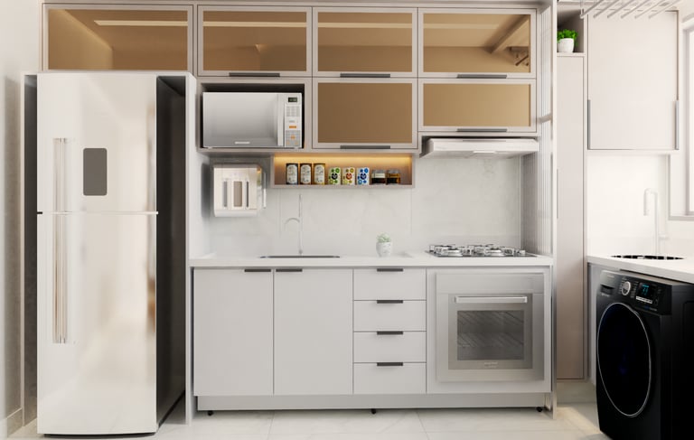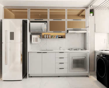 Recebemos o desafio de levar funcionalidade e estilo para essa cozinha bem compacta! Nossos clientes queriam algo clean e que trouxesse a sensação de amplitude, então escolhemos tons neutros para marcenaria e revestimentos. As portas reflecta nos armários superiores ajudam na extensão do ambiente. E para divisão da área de serviço, utilizamos portas em vidro canelado que permite que a luz natural continue a fluir pelo espaço.