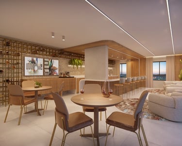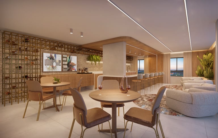 O Wine Bar projetado pelo Arqmea para o Residencial Link Artemia, em Feira de Santana, une sofisticação e funcionalidade. Desenhamos uma marcenaria elegante em tons amadeirados e escolhemos um mobiliário contemporâneo, aliado aos elementos decorativos que tornam o ambiente mais acolhedor e moderno. Um espaço pensado para que seus futuros moradores possam criar boas memórias afetivas.